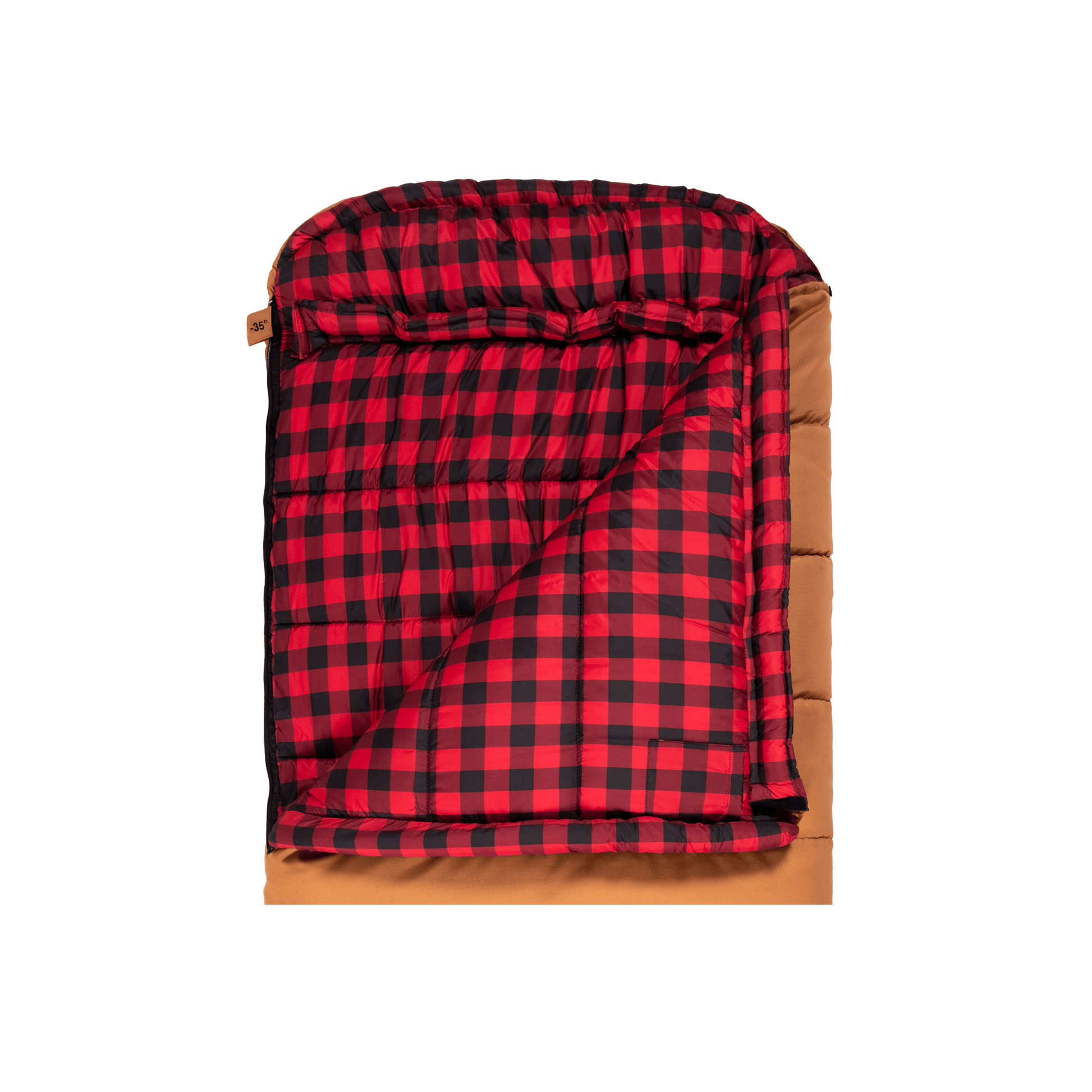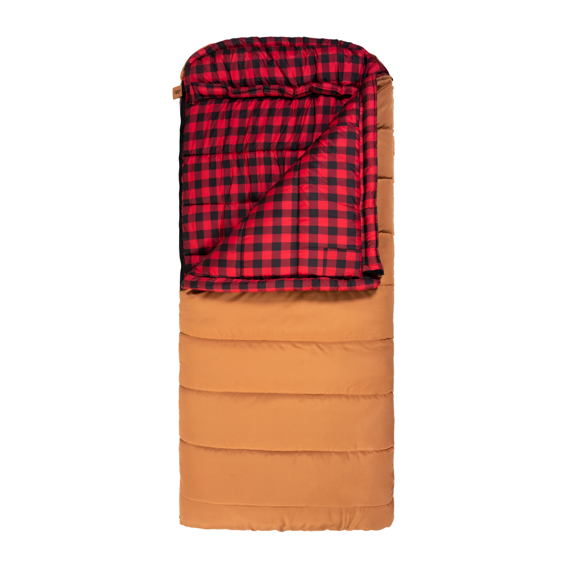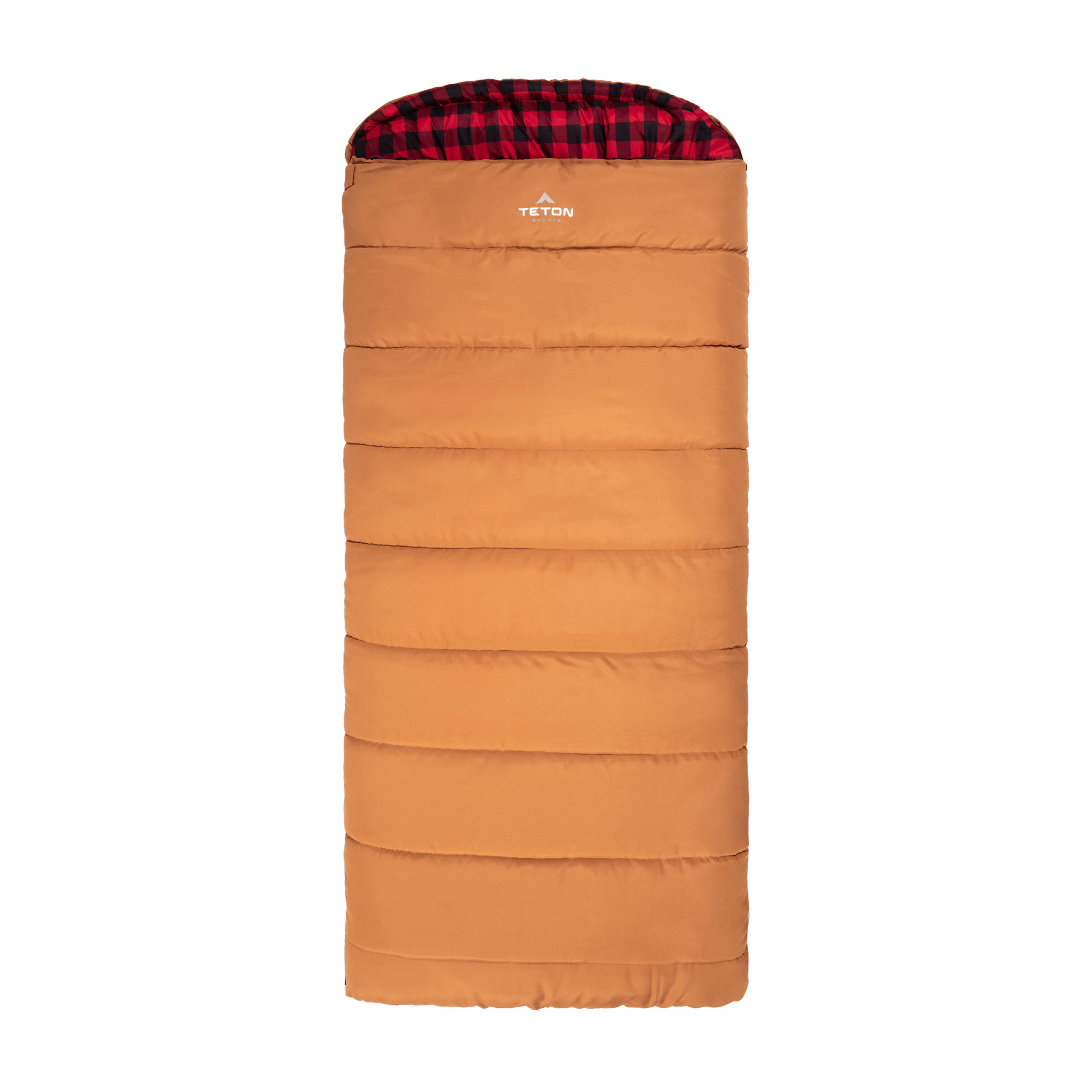 Experience ultimate comfort with the Bridger Sleeping Bag, our largest and most spacious sleeping bag. Significantly wider than standard rectangle bags, this oversized durable sleeping bag with flannel lining and a cinchable mummy hood is designed for those who crave extra room. The ultra-tough canvas exterior retains heat efficiently, while the soft flannel lining ensures you feel warm all night long. Perfect for a range of weather conditions from -35˚F to +20˚F and available in multiple sizes: Li'l Junior (kids), Regular, or Mammoth Double (two-person), choose the temperature rating and size that matches your family camping adventure. Whether you’re facing warm summer nights or frigid winter conditions, this is our warmest bag yet. Sleep easy. Shop Teton.