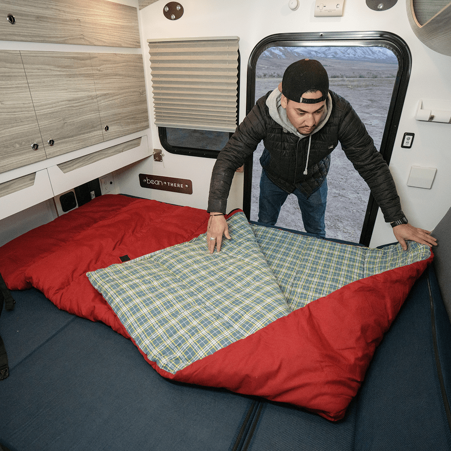 - Transforms into camp blanket with two-way L-zip