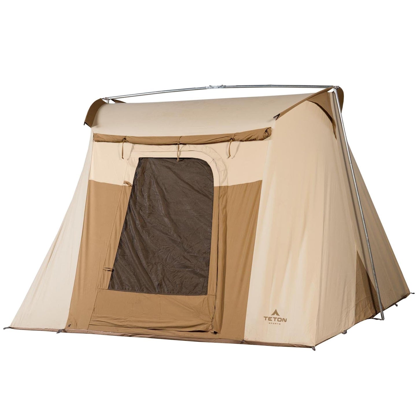 Set up camp effortlessly with the Teton Mesa Canvas Tent, a spacious cabin-style retreat designed for easy setup. Featuring a flex bar bracket system, pitching this heavy-duty canvas tent is a breeze. Crafted from 100% cotton canvas with an ultra-durable bathtub floor, the Mesa ensures durability and breathability in any environment. Enjoy additional shade with the easy-to-use awning. Extras include overhead gear lofts, organizers, and heavy-duty steel stakes for added convenience and security, rigging this four season tent for harsh weather. Camp cozy. Shop Teton.