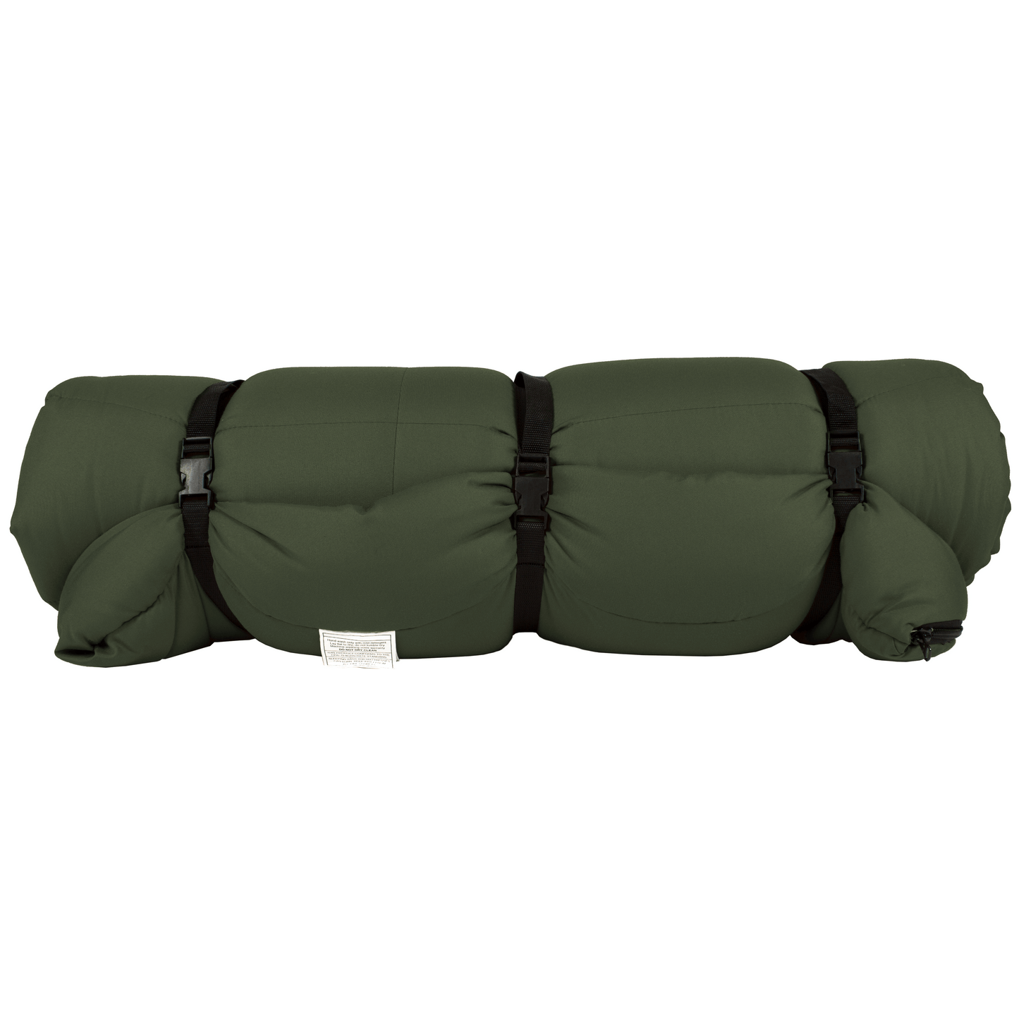 Oversized canvas sleeping bag with flannel lining and a cinchable mummy hood.