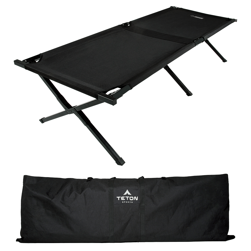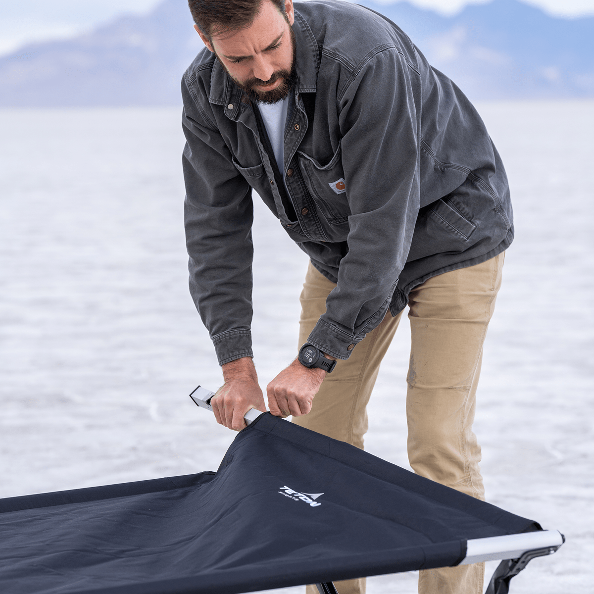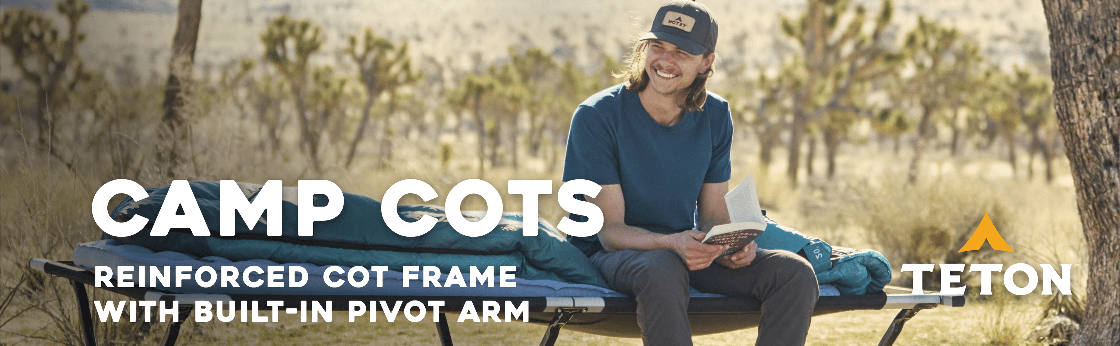 After a long day out in the elements and making camp, the last thing you want to do is wrestle with impossibly tight camp cot crossbars. That’s why our Camp Cot comes with a patented pivot arm: a built-in lever that swivels the final, tightest crossbar into place like a breeze and makes the fourth corner as easy as the first. Choose between three sizes: Outfitter XXL, Universal XL, or Adventurer Regular. Our heavy-duty folding cots are built for strength, made with 600D Oxford canvas and steel legs that supports up to 400 lbs. (Adventurer or Universal) or 600 lbs. (Outfitter). Pair this cot with the Outfitter XXL, Universal XL, or Adventurer Regular Canvas Camp Pad for a satisfyingly flawless fit. Sleep easy. Shop Teton.